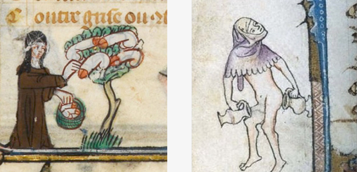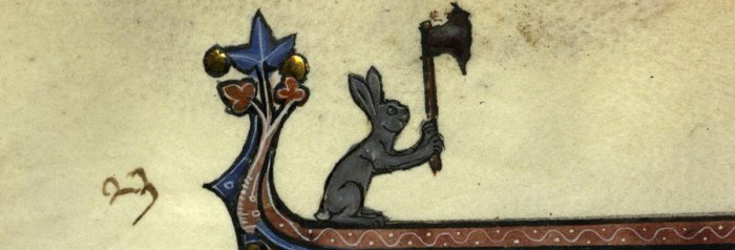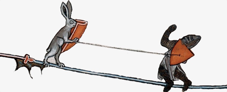 In de Europese geschiedenis leek hier en daar eveneens gezinspeeld te worden op de martiale kant van de konijnenpsyche – de killer rabbit van de *kuch* historische documentaire van Monty Python behoeft geen verdere introductie, en in de marginalia van manuscripten worden konijnen vaak afgebeeld in wapenuitrusting, rijdend op wolfshonden of leeuwen en gewapend met bijlen en zwaarden ten strijde trekkend tegen de mens – maar ook op dat vlak werd mijn enthousiasme al snel de kop ingedrukt: middeleeuwse illustratoren steken in de marges voortdurend de draak met de gevestigde orde en laten al net zo lief leeuwen viool spelen, nonnen penissen uit bomen plukken of… nou ja wat in die derde illustratie hieronder verder ook aan de hand moge zijn.