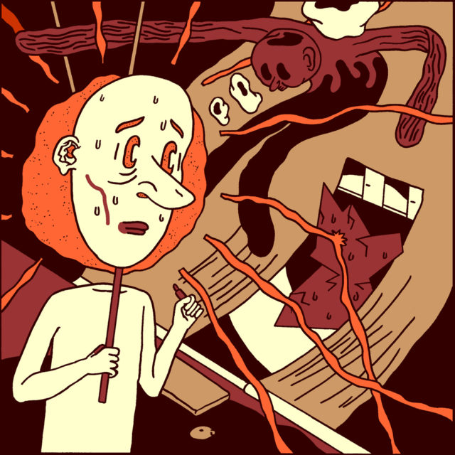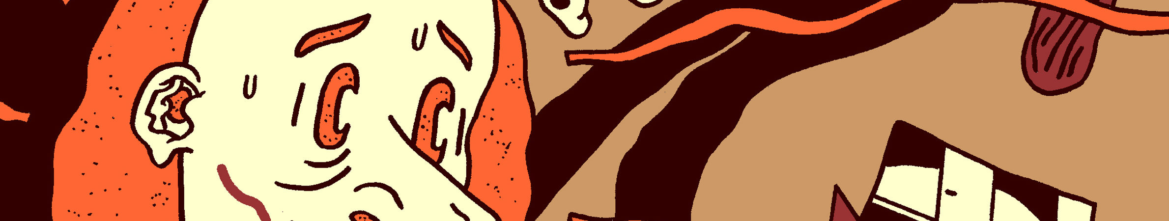 Voorzichtig gluur ik over een rij kisten. Het fakkellicht laat schaduwen op de muren dansen. Er liggen mannen op de grond. Kronkelend. Een rode dromenman met fel gewaad. Zijn gezicht is geverfd. Zwarte strepen rond zijn ogen. Vetbobbels op zijn borst. En een normale man. Zijn stropdas is losgetrokken. De verf heeft vlekken achtergelaten op zijn gezicht. Ze drukken hun gezichten op elkaar, schokken, bijten, mondenvol geluidloze schreeuwen.