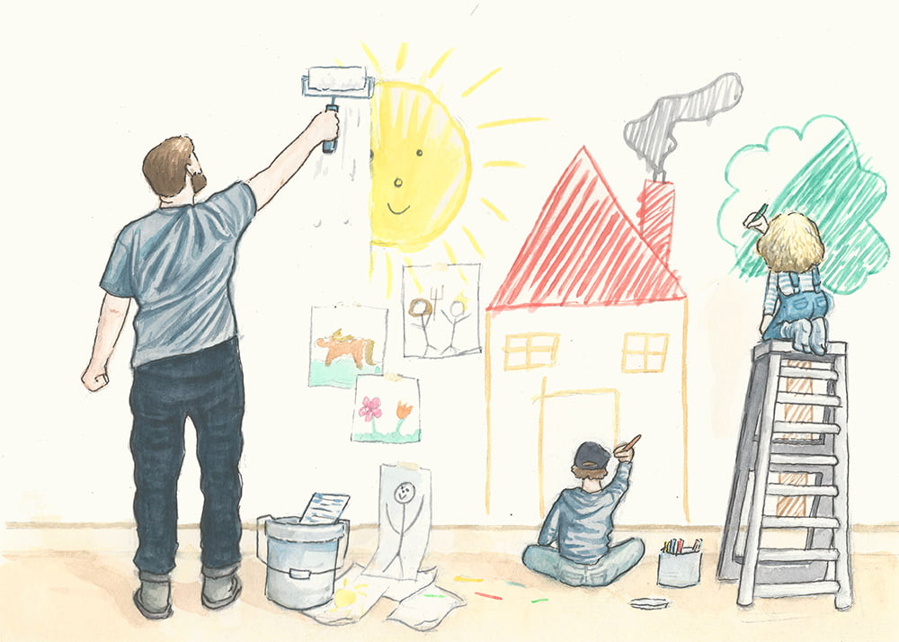Toen je grootouders jullie een enorme doos waskrijt gaven – om jullie fantasie de vrije loop te laten – vergaten ze dat bij dit soort cadeaus het aantal blanco vellen papier gelijk moet staan aan de beschikbare hoeveelheid verf, potlood of krijt. Helaas was het luttele aantal pagina’s in het tekenblok dat erbij zat in een mum van tijd op, waardoor er in de doos nog een hoop krijt overbleef. Als gevolg werd ik getrakteerd op een tekening van betwistbare schoonheid op de witte muur in de gang. Dezelfde muur die ik de weken daarvoor met zo veel moeite had gewit, op verzoek van jullie moeder. Een klus met strenge voorschriften: ik moest alles ’s ochtends schilderen zodat we daarna de ramen open konden gooien en de verflucht tegen het eind van de dag was verdwenen.