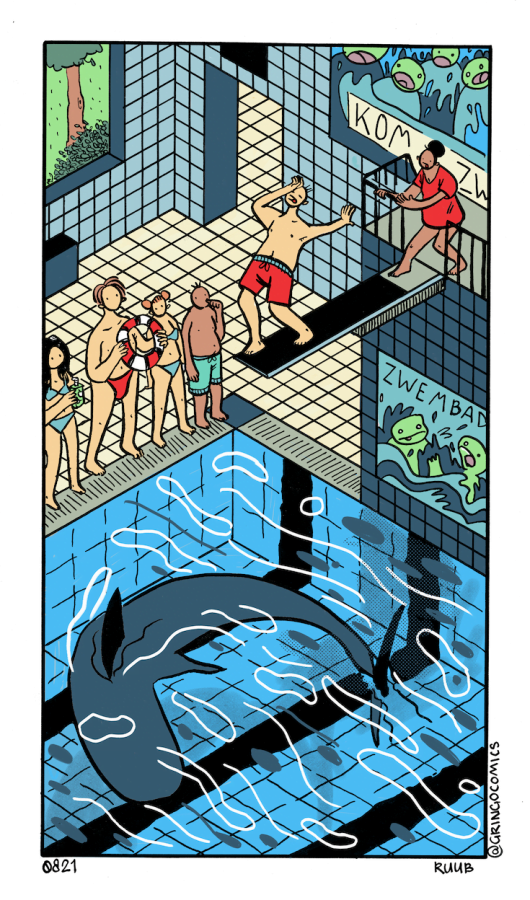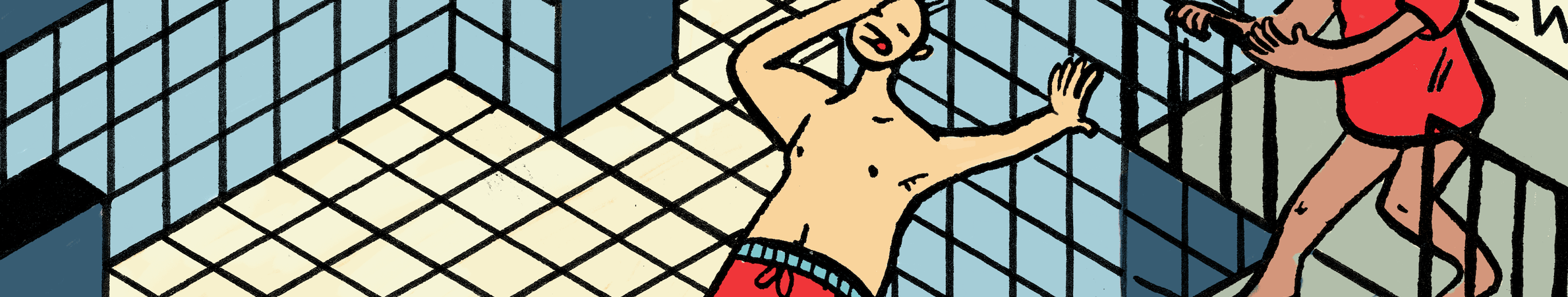 Door mijn herinneringen aan het incident zag ik ook de rest van zijn verschijning plots helder voor me, en ook die bleek met terugwerkende kracht met die van een pedo te rijmen. Gehuld in Speedo, tanktop en teenslippers scheen hij immers altijd met angstzweet behangen, als was hij consequent waakzaam doorzien te worden. Zijn kinderlijke bloempotkapsel en onthaarde borst en benen pasten eveneens in dat plaatje. Mogelijk kampte hij met een peterpancomplex, en zag hij in al die vrolijk rondspattende kinderlijfjes geestelijke leeftijdsgenootjes, die gerust als seksuele partners konden dienen. Alhoewel, dat gladgeschoren lichaam kon natuurlijk ook zijn terug te voeren op oude olympische aspiraties, en bij nader inzien kon ik dat behangsel van glimmend ‘angstzweet’ aan nagenoeg alle olympische zwemmers toeschrijven.