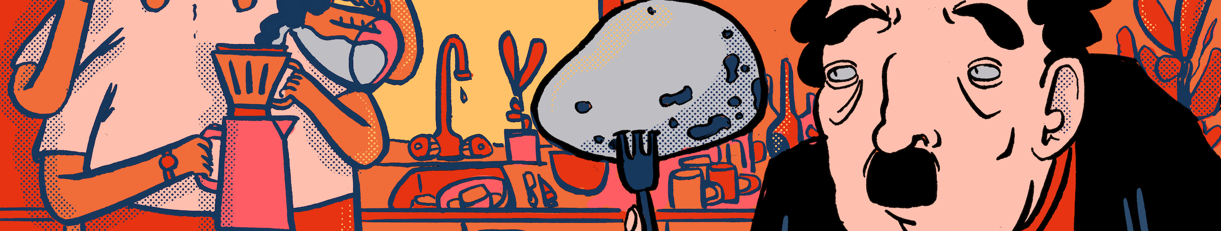 ‘Niet nadenken, doen. Twee vorken. Twee aardappels. Beide heb je. De vorken liggen in de la. En wij weten allebei dat je eergisteren een kilozak vastkokende piepers hebt gekocht.’