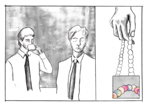 Ik keek om me heen, sloot mijn ogen en stak toen mijn onderarm in het lauwe water. Op de tast zocht ik de armband, trok hem van de bodem en liet hem uitlekken boven de pot. Schuldbewust en secuur droogde ik hem af met een stuk wc-papier. Daarna stak ik hem in de broekzak van mijn pantalon, als een edelsteen die een bepaald type mens bij zich draagt vanwege de holle belofte voor positieve krachten.